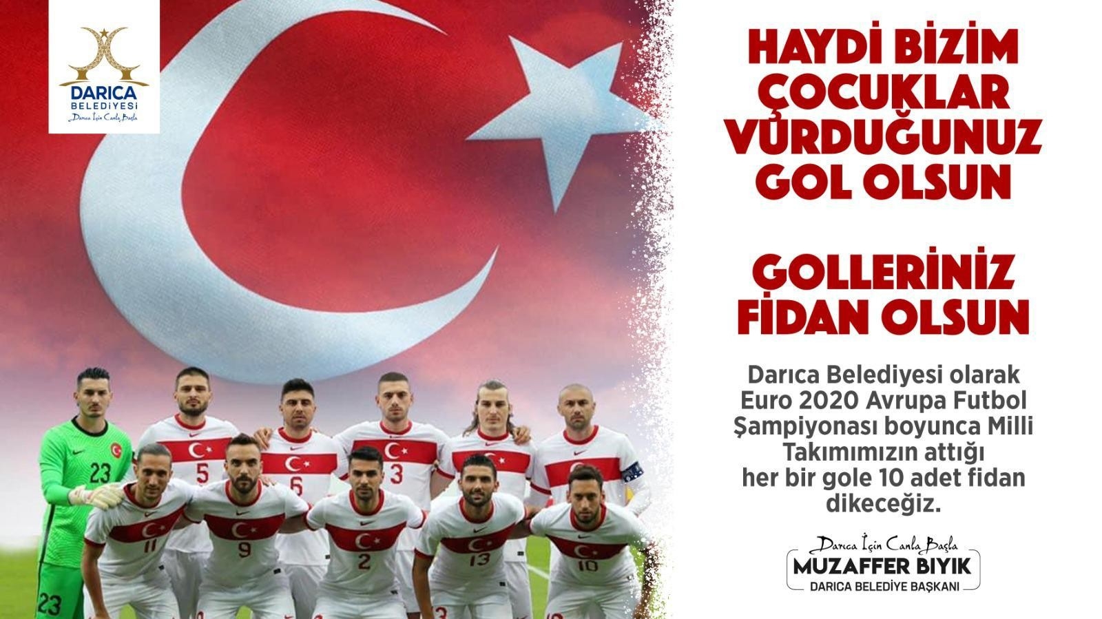 EURO 2020 Avrupa Futbol Şampiyonası, A Ulusal Futbol Grubunun saat 22.00’de İtalya ile karşılaşacağı gayret ile başlayacak. Gayret öncesinde Darıca Belediyesi, örnek bir projeye imza atıyor. Darıca Belediyesi, ulusalların Euro 2020 Avrupa Futbol Şampiyonası boyunca atacağı her gol için 10 fidan dikileceğini ‘Haydi bizim çocuklar, vurduğunuz gol olsun, golleriniz fidan olsun’ sloganıyla açıkladı.