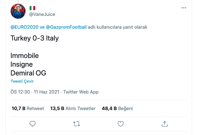 UEFA’nın yayınladığı “skor tahmini” paylaşımına bir taraftar maçtan 11 saat evvel; maçın 3-0 İtalya üstünlüğüyle tamamlanacağını yazdı. Bundan daha da değişik olanı, Merih Demiral’ın kendi kalesine gol atacağını ve öbür gollerin Immobile ve Insigne’den geleceğini de kestirimine ekledi. İtalyan taraftarın bu paylaşımını maçtan sonra binlerce kişi beğendi.